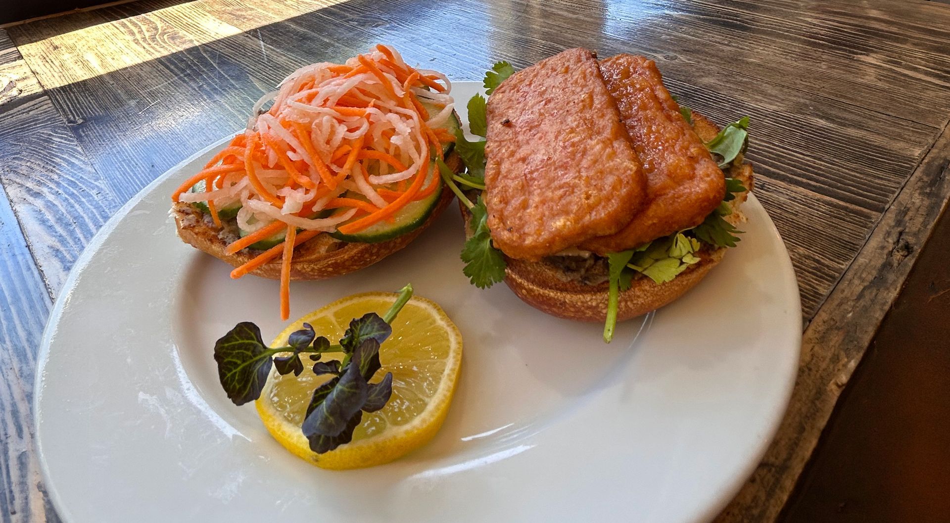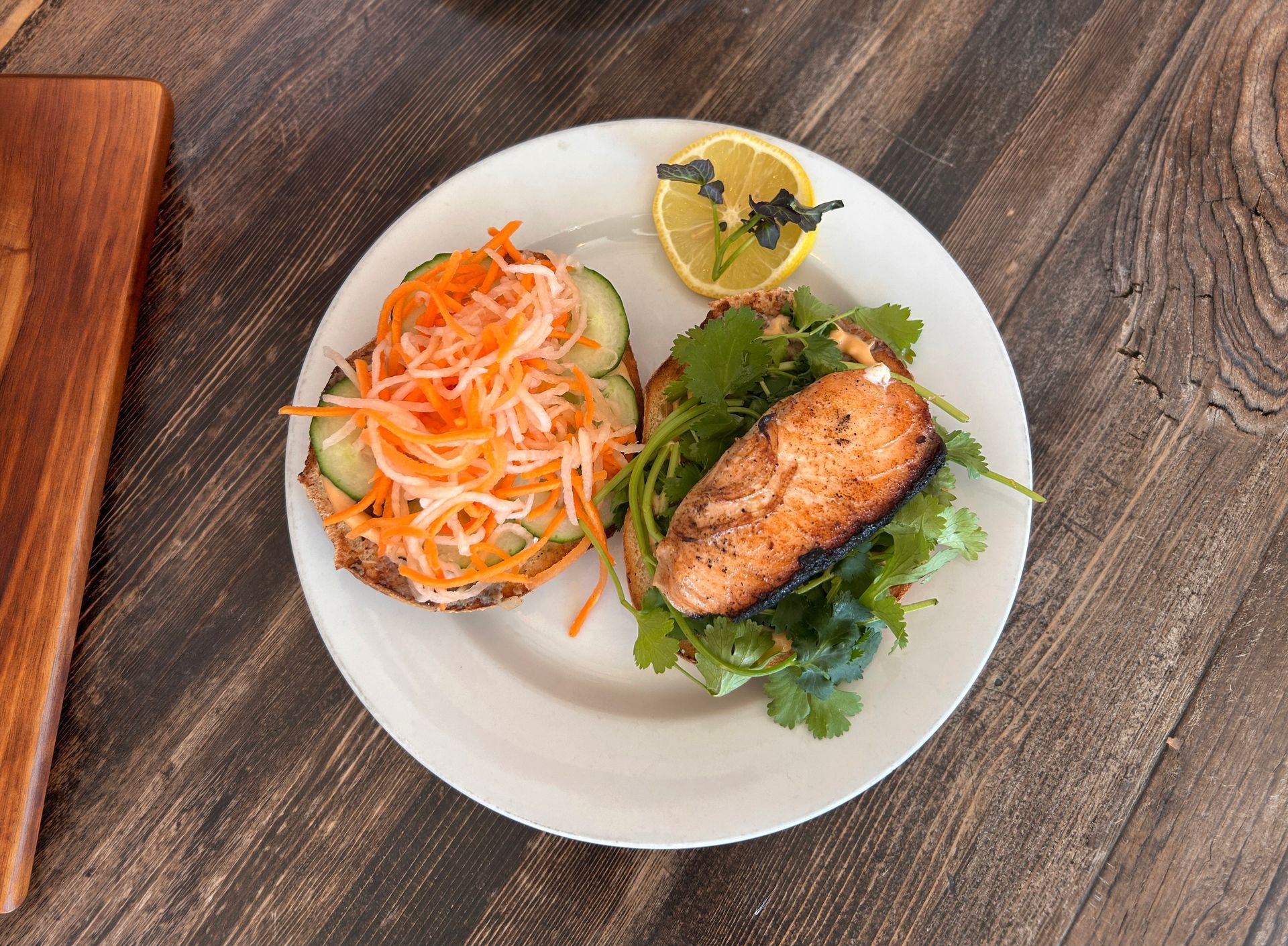 The Banh Mi Bagel Sandwich is one of Dan's and Mike's favorite sandwiches and we just had to bring it back for April. It's perfect for everyone with your choice of caramelized salmon or a vegan patty, mixed mushroom paté, pickled daikon and carrots, cucumber, with a spicy mayo.